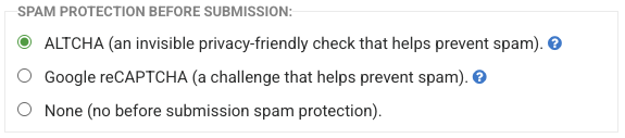 ALTCHA is a GDPR-compliant form abuse protection option that effectively prevents automated form submissions without requiring respondents to solve a puzzle.