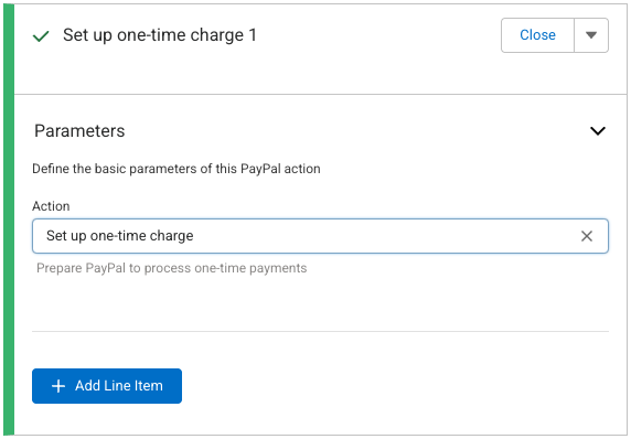 This dependent action defines the individual line item(s) for the one-time charge checkout. Define a custom charge line item with the following fields: