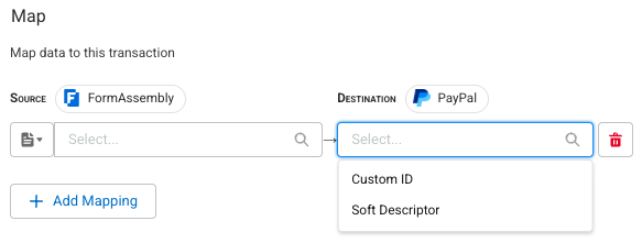 - Custom ID: Allows you to associate FormAssembly data with PayPal transactions. When you map a value to the Custom ID field, it appears in the PayPal transaction details, helping you track and identify specific transactions.