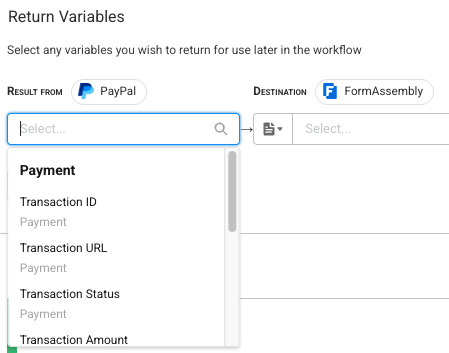 Return variables can be mapped to form fields or workflow variables, allowing payment details to be referenced in later workflow steps or for confirmation messages. The following values from a one-time charge transaction can be set as return variables for use later in the workflow: