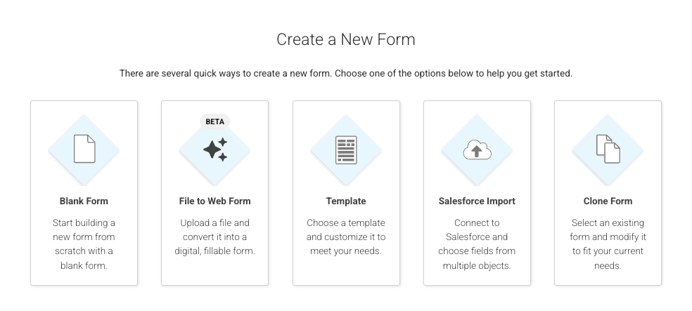 You may also see options to create a form by importing from Salesforce or converting an existing file, such as a PDF or spreadsheet. These options are useful when your form already exists elsewhere, and you want to avoid recreating it manually. Using these options results in a fully editable form, just like any other option from this screen.